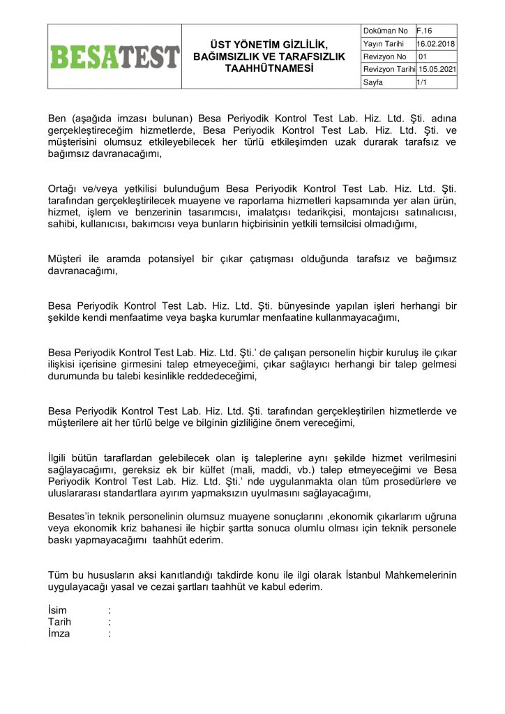 • Üst Yönetim Gizlilik,Bağımsızlık ve Tarafsızlık Taahhütnamesi